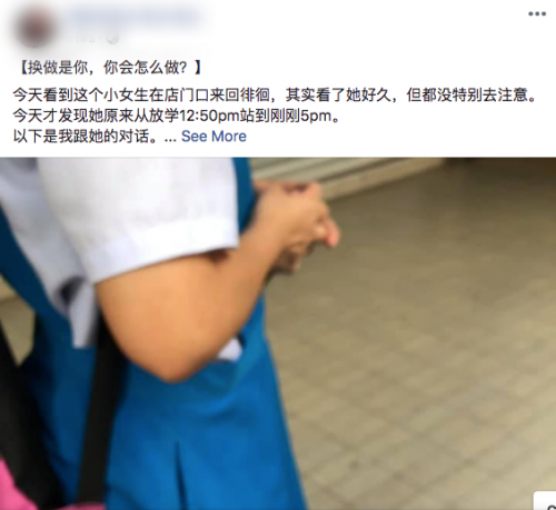 事情是发生在砂拉越诗巫的卫里中学,该网民看到一名女中学生在学校附近的店门口徘徊,所以上前关心,询问是否需要帮忙,但却问出了惊人的故事。