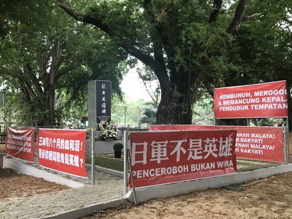 这些挂在围栏上的横幅,除了有中文,也有马来文注明,包括“日军不是英雄”、“杀害、强奸、砍本地人头颅”等等字眼。