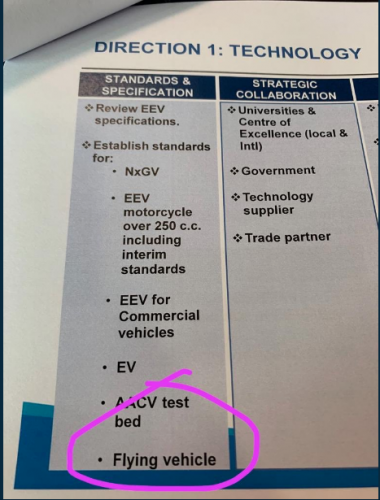 凯里昨日在其推特贴出国家汽车政策检讨会议内容,其中一项讨论项目是关于飞行车计划。