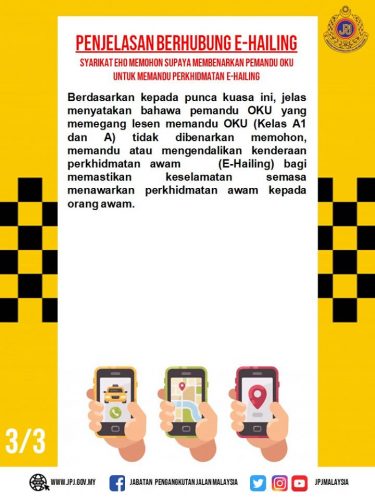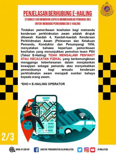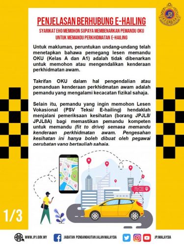 陆路交通局昨日在其面子书贴文表示,持有A或A1驾照的残障人士,不能申请驾驶公共交通包括电召车。