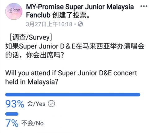 值得一提的是,该粉丝专业在不久前才在面子书发出一个调查投票文,内容是“如果Super Junior D&E在马拉西亚举办演唱会的话,你会出席吗?”,有多达93%的人都投票会出席这场演唱会!