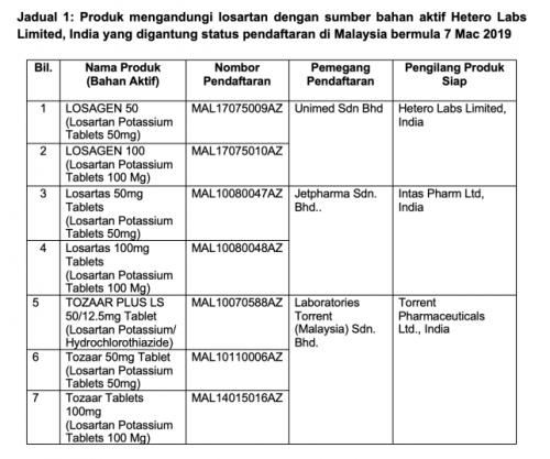 卫生部总监诺西山发表文告指出,随着新加坡卫生部下令将印度Hetero Labs Limited药厂生产的3款血压药下架,以后,大马药物管理局也于3月7日要求7款高血压药物即可下架。