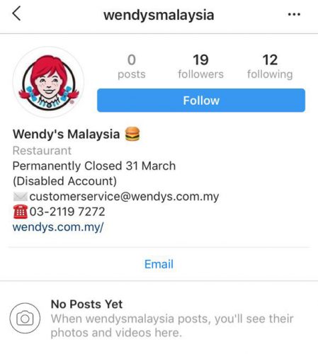消息传出,持有Wendy’s特许经销权的Berjaya Burger有限公司因决定不再更新他们与Wendy’s的特许协定,因此Wendy’s从明日起便会离开大马,而大马Wendy’s的官方Instagram帐号也透露将在3月31日后永久关闭。