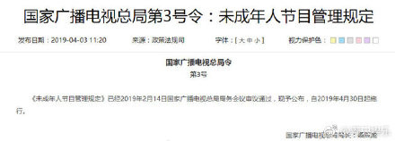 大陆广电局发布《未成年人节目管理规定》将于30日起施行。