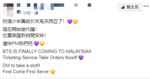 虽然官方还没证实消息,但粉丝们已经开始组团准备抢票了,还有代购网站也开始招收BTS大马演唱会的代购门票,看来BTS的魅力真的势不可挡啊!