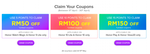 这项促销从即日起至4月30日在Honor官方网站进行!每天前往官方网站报道,可获得1积分,当你累计满5个积分时可以获得RM50的折扣劵;满10个积分时,可获得RM100折扣劵;满15个积分时,则可获得RM150折扣劵!