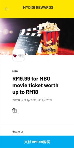 看戏有优惠!一张电影票只需RM9.99! 5 Apr , 2019 | 吃喝玩乐 Digi和MBO戏院合作推出RM9.99电影票优惠!Digi用户只要打开MyDigi应用程序的Rewards选项,选择MBO即可享有这个超值的电影票特价优惠了! 这项优惠从即日起至4月30日,每天提供特定的数额!不过需要注意的是,每位用户只限领取4张! 成功获得RM9.99 MBO电影票的用户,将会获得一个电子礼劵!你只需向MBO柜台员工展示电子礼劵,即可以特价购得电影票! 分享