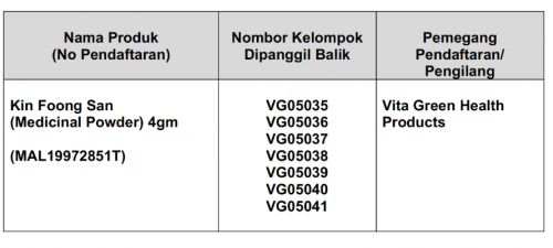 卫生部总监诺希山今日发表文告指出,又Vita Green Health Product生产的惊风散在经过样本化验后发现,里面含有的重金属汞、镉超标,涉及的惊风散型号入下:
