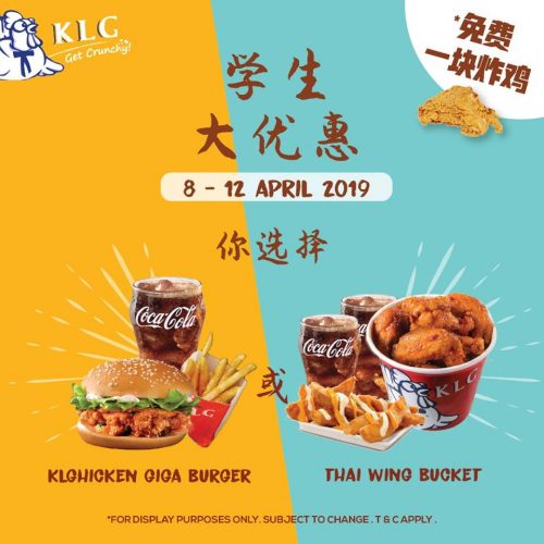 你喜欢鲜嫩多汁的鸡腿汉堡还是香辣可口的泰式鸡翅呢?从4月8日至12日,只要到KLG购买鸡腿汉堡(KLGhicken Giga Burger Meal)或泰式鸡翅(Thai Wing Bucket Combo)套餐,就可以得到一个免费炸鸡!