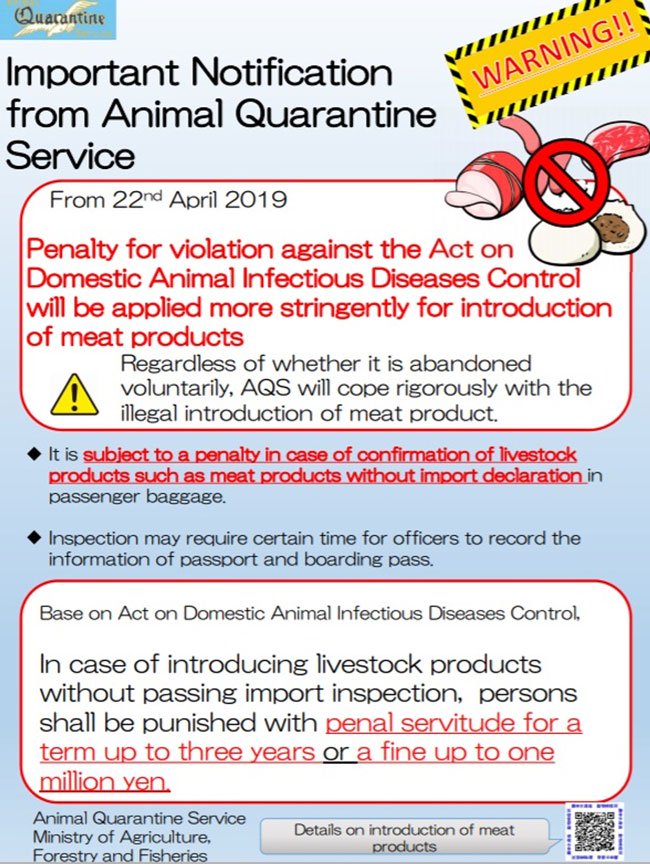 带肉制品入境日本无申报 罚! 7 Apr , 2019 | 民生百事 (吉隆坡7日讯)准备去日本的游客要注意了! 日本农林水产省公布,从4月22日起,凡是带肉类制品入境但未申报,将被罚款最高100万日圆(约3.7万令吉)或被判3年有期徒刑。 农林水产省在网站发布通告,指将会更严格执行《家畜传染病预防法》。 通告也提到,随着许多国家陆续发生与家畜家禽相关的疾病,加上肉制土产或个人消费类产品难以取得检查证明书,因此都不允许带入日本。 通告说,即使只是少量的肉制品,包括自己食用分量和真空包装,也一律不准带入境。 分享