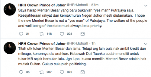 王储今日在其推特推文指出,苏丹依布拉欣陛下早在数月前就已考虑要撤换州务大臣。