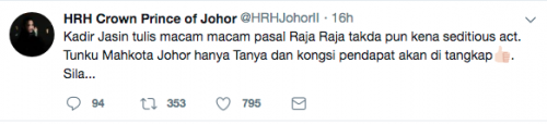 王储还质问,为何首相媒体顾问卡迪耶欣评论马来统治者没有被控煽动,但他发表看法就要被逮捕?