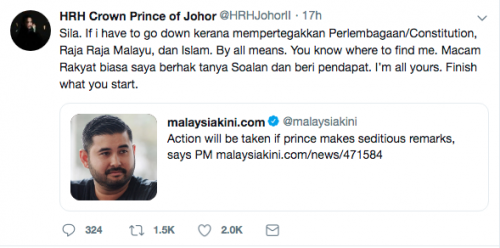所以马哈迪就说:“王储只是一名普通人,也是受到法律约束,因此若王储发表煽动性言论,我们会采取行动,他并非在法律之上。”