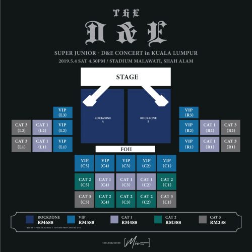 RM688 ROCKZONE (STANDING), RM 588 (VIP – Numbered Seated), RM488 CAT 1 (CAT 1 –Numbered Seated), RM388 (CAT 2 – Numbered Seated), RM238 (CAT 3 – Numbered Seated)