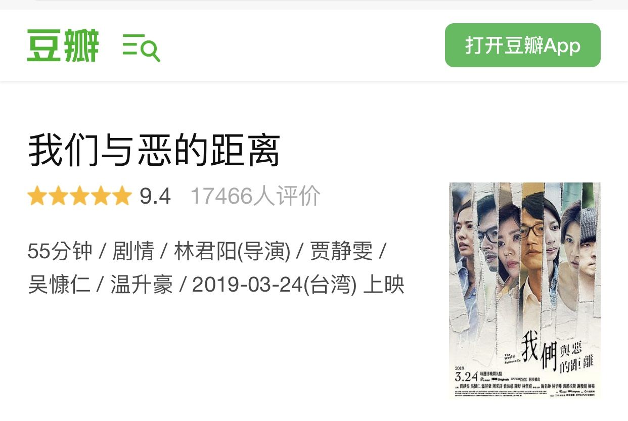 电视剧《我们与恶的距离》不仅成为全台轰动的焦点,甚至也红到大陆和香港,就有多家港媒在近期力推该剧,称赞台湾挖掘优质戏剧,也警惕港剧现正倒退中,更有港媒直指《与恶》非看不可,而该剧在大陆豆瓣的分数更高达9.4分,认为《与恶》是大陆想拍又不敢拍的剧,让该剧风潮延烧到更多华人世界。