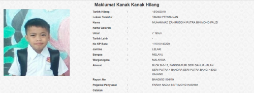 扎希最后一次被人目击时身穿黑色T恤蓝色长裤,若有人发现男童行踪可拨电至012-3600232或03-8738222到加影警区。或致电賽妮0183201341。
