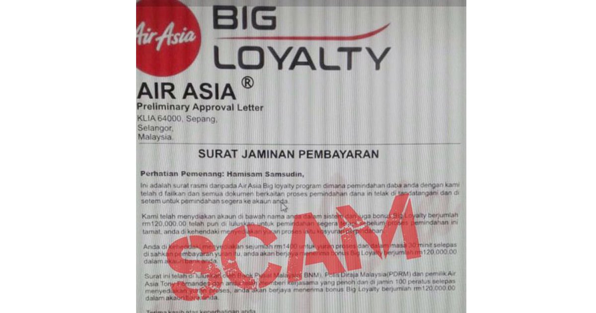 亚航今日发表文告指出,诈骗集团利用亚航品牌进行诈骗,因此促请公众保持谨慎,避免受害。