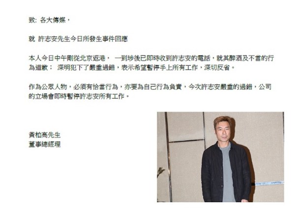 9月演唱会告吹!许志安经纪人就出轨事件再发声明 17 Apr , 2019 | 娱乐前线 许志安与黄心颖曝出轨风波,安仔开记者会道歉,事后经纪人黄柏高为事件发声明,强调会暂停安仔手上所有工作,即暗示安仔九月红馆演唱会将会告吹。 全文如下: 致:各大传媒, 就许志安先生今日所发生事件回应 本人今日中午刚从北京返港,一到埗后已即时收到许志安的电话,就其醉酒及不当的行为道歉;深明犯下了严重过错,表示希望暂停手上所有工作,深切反省。 作为公众人物,必须有恰当行为,亦要为自己行为负责,今次许志安严重的过错,公司的立场会即时暂停许志安所有工作。 黄柏高先生 董事总经理 分享
