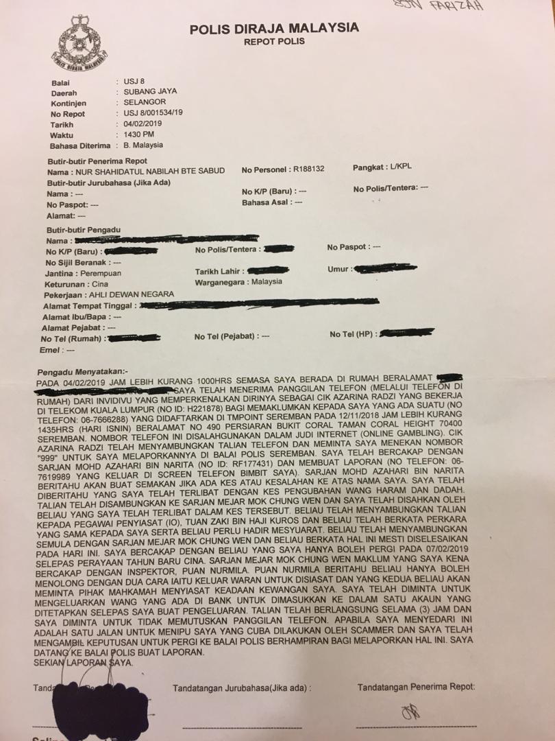 她指出,她是在今年除夕日上午收到一通自称是TM的电话,对方指是接获通讯及多媒体委员会(MCMC)通知,指她曾在芙蓉TM Point注册一个电话号码,而该电话号码是涉及在一宗网上金钱游戏的案件,因此会中断她家电话号码服务。