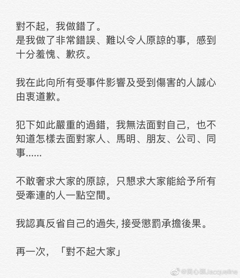 黄心颖就出轨许志安一事发文道歉:“我认真反省自己的过失, 接受惩罚承担后果。”