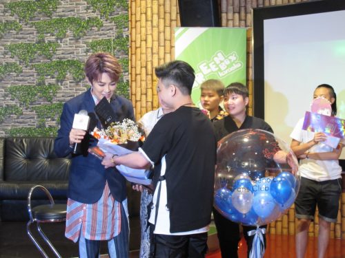栗子(粉丝昵称)送上花束和气球给刘力扬。
