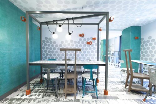从照片上来看,店内的墙身以蓝、绿及白色为主,之后再排列着超大的灰色波尔卡圆点,非常有趣!
