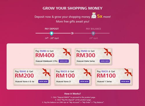 举例:你想要购买原价RM2899的Huawei Mate 20X,你预先附上RM60作为购物订金,之后这笔数额便会慢慢的增加,最高至5倍,也就是RM300!当你付款的时候,你可以直接享有享有折扣,只需附上RM2599即可以了!