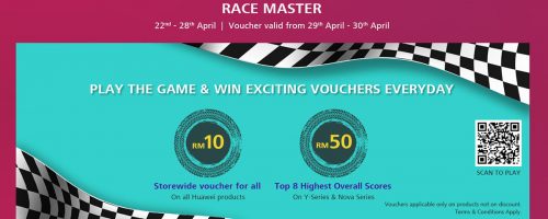 只要参加Race Master小游戏,即可获得RM10的折扣劵,前8名高分的玩家还能获得一个RM50的折扣劵,以购买Huawei Y7 Pro、Huawei Y9、Huawei Y Max、Huawei nova 3i、Huawei nova 4及Huawei nova4e!