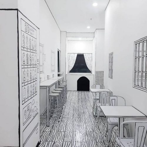 黑白漫画风的奶茶店?那人是真的在里面吗?是的,你没看错,里面所有的桌椅都是可以坐、可以摸的哦!当你站在里面拍照时,逼真的2D视觉效果,真的会让人仿佛走进漫画世界一样,看起来超好玩der!