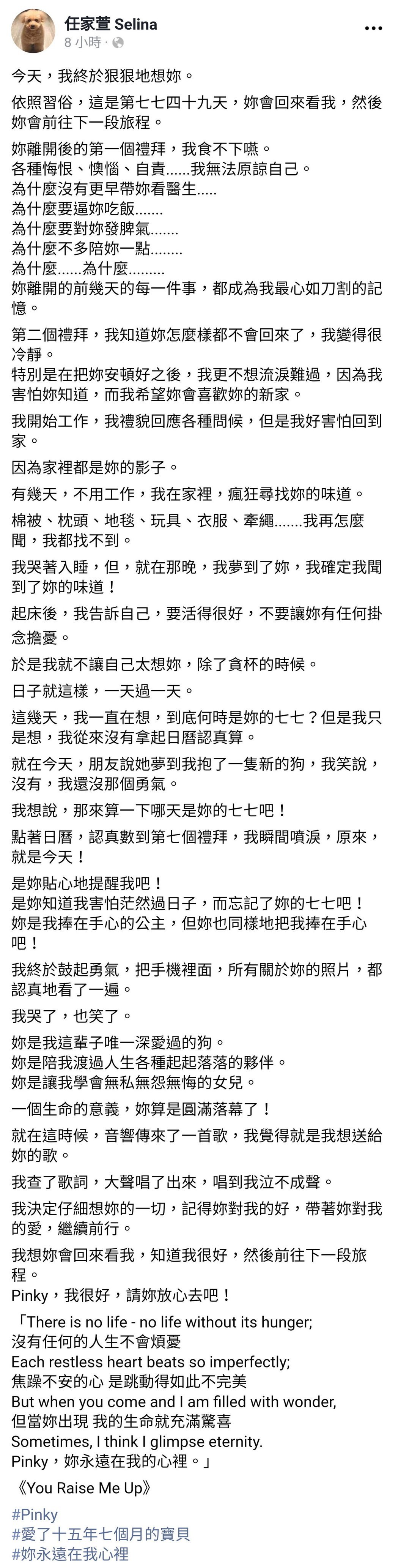 Selina在脸书上发长文写道,“今天,我终于狠狠地想妳。依照习俗,这是第七七四十九天,妳会回来看我,然后妳会前往下一段旅程。”,接着更透露在Pinky走后,她心情上的转变,“妳离开后的第一个礼拜,我食不下咽。各种悔恨、懊恼、自责……我无法原谅自己。”,“第二个礼拜,我知道妳怎么样都不会回来了,我变得很冷静。”、“我开始工作,我礼貌回应各种问候,但是我好害怕回到家。”、“因为家里都是妳的影子。有几天,不用工作,我在家里,疯狂寻找妳的味道。”、“我哭着入睡,但,就在那晚,我梦到了妳,我确定我闻到了妳的味道!”,到了后期Selina开始数着日子,何时能到七七“点着日历,认真数到第七个礼拜,我瞬间喷泪,原来,就是今天!”