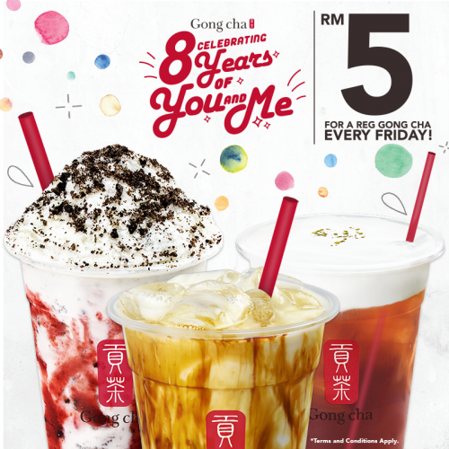贡茶欢庆8周年推出RM5促销 5 May , 2019 | 吃喝玩乐 【促销】贡茶GongCha欢庆8周年推出超值促销,现只需RM5即可购买任何一杯饮料! 为回馈顾客长期以来的支持,贡茶日前在面子书宣布推出RM5超值促销!这项促销从即日起开始,每逢星期五推出!无论是招牌奶盖系列、还是珍珠奶茶或其他饮料,全部都可以享有RM5优惠哦! 想要喝贡茶的朋友,可以到邻近的分店购买! 分享