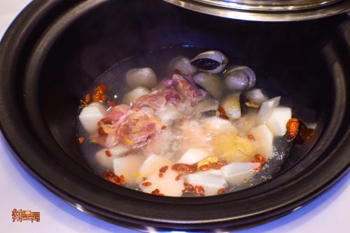 这里的蒸汽海鲜一锅两食,在烹饪之前你可以选择汤或粥底,上层的海鲜及肉类在蒸煮过程中,就会把精华流入锅内!这样底下的汤或粥底,就会变得香浓可口!