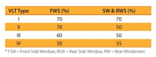 第一类是符合联合国条例(前挡风镜、侧窗、车后挡风镜的透光率为70%);第二类是符合马来西亚条例要求;第三类是不符合马来西亚条例要求;第四类的车皆不符合联合国及马来西亚条例要求(车前挡风镜的透光率为50%、侧窗、车后挡风镜为35%)。