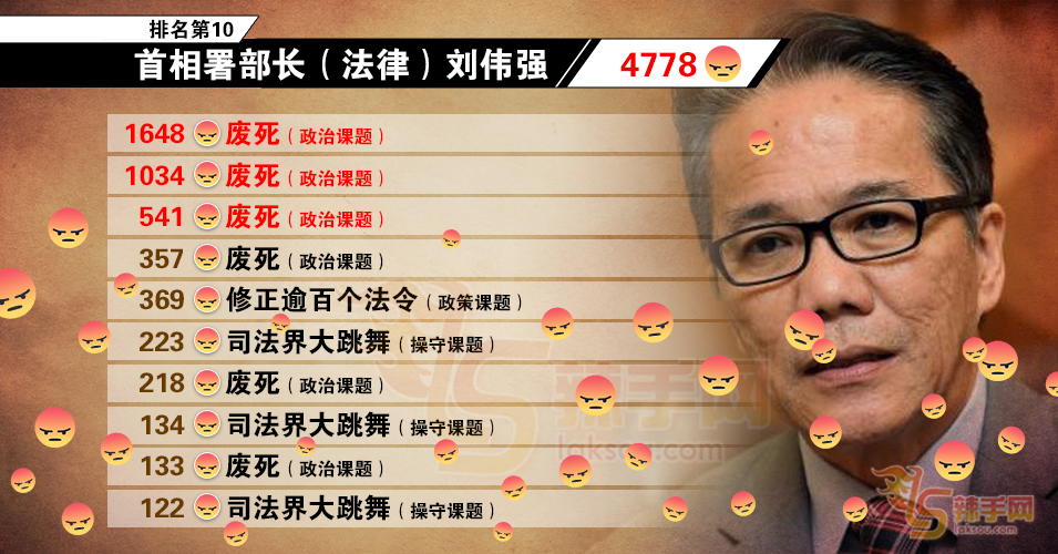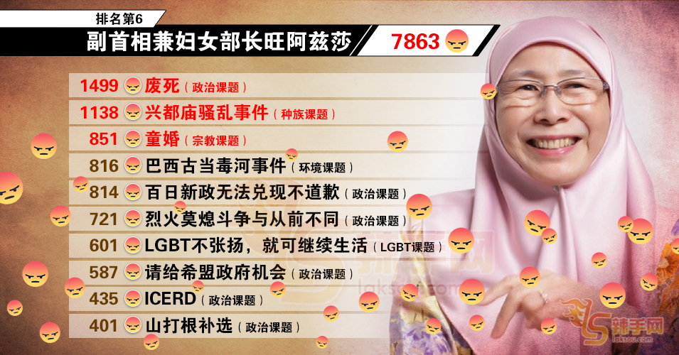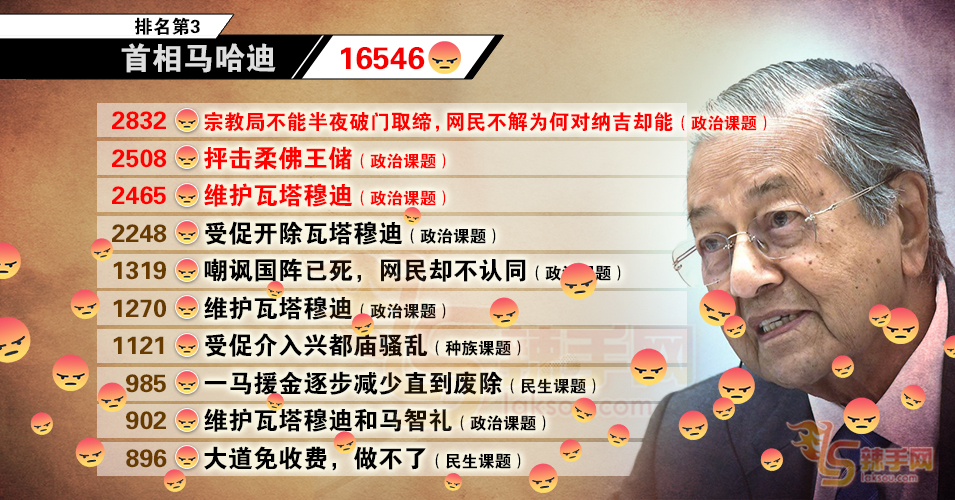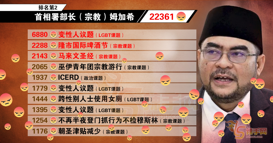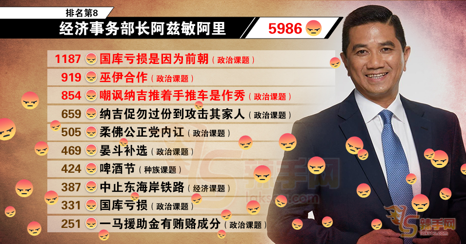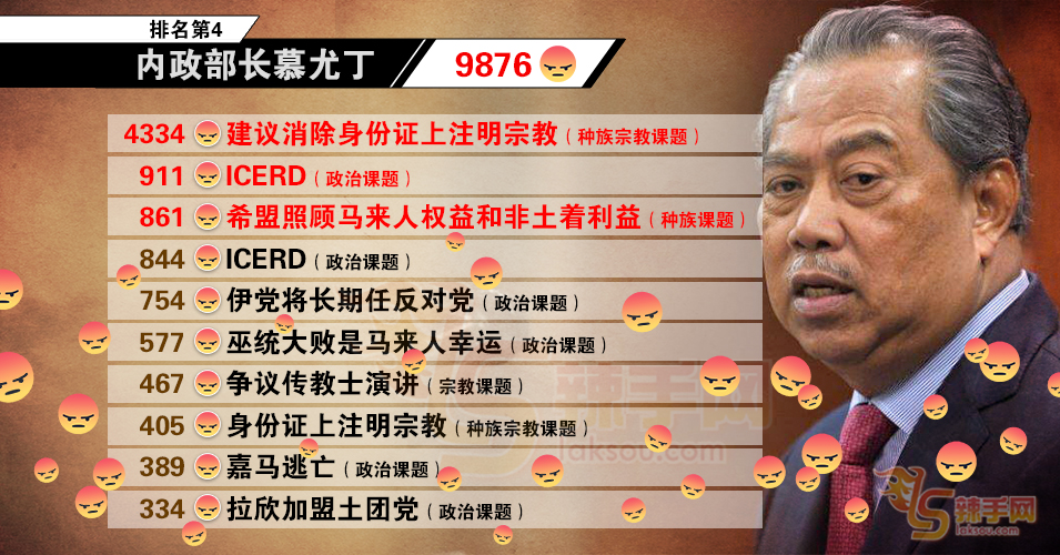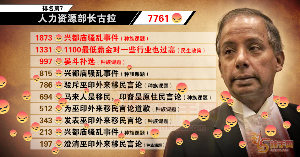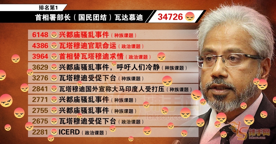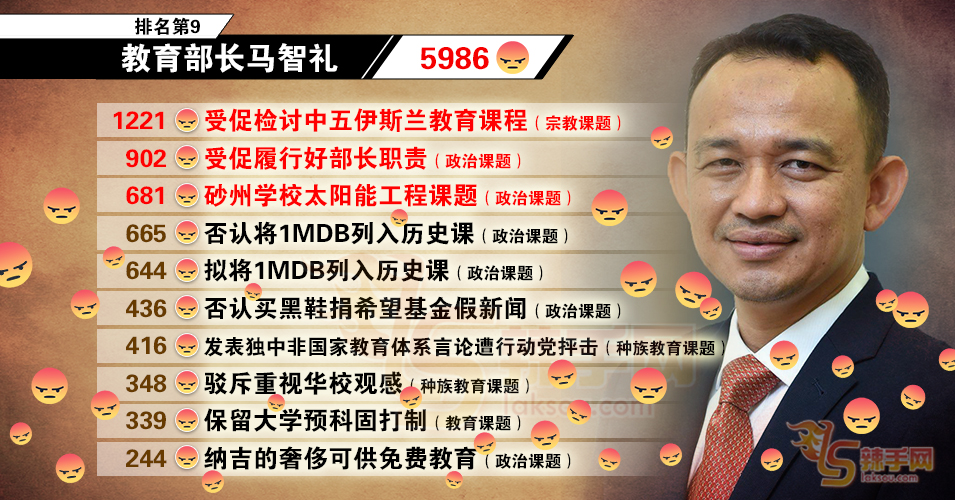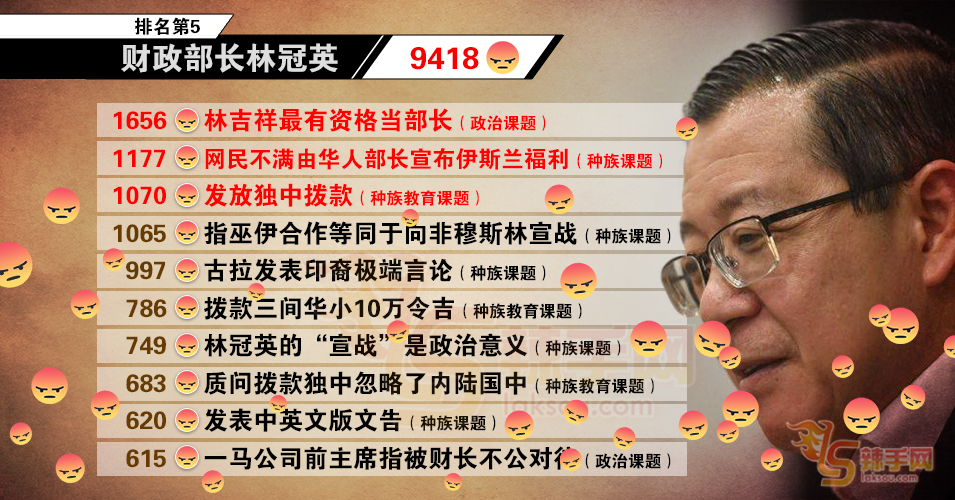 为了得出人民在过去一年,对部长施政及言行的观感,《辣手网》运用了大数据系统分析,针对非中文媒介语网民,搜罗所有在马来西亚注册的脸书专页(FB page),筛选出50个讨论度最高的最热帖(hot post),再从中得出获得最多愤怒表情符号(emoji)的10大帖子。