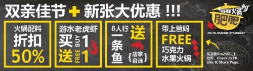 【促销】肥肥海鲜火锅新店开张大促销,火锅配料折扣高达50%,而且新鲜老虎虾买一送一!配合双亲节的到来,他们也将为大家免费送上一条鱼及巧克力水果火锅当甜品哦!还没想好去什么地方庆祝的朋友们,可以安排上!