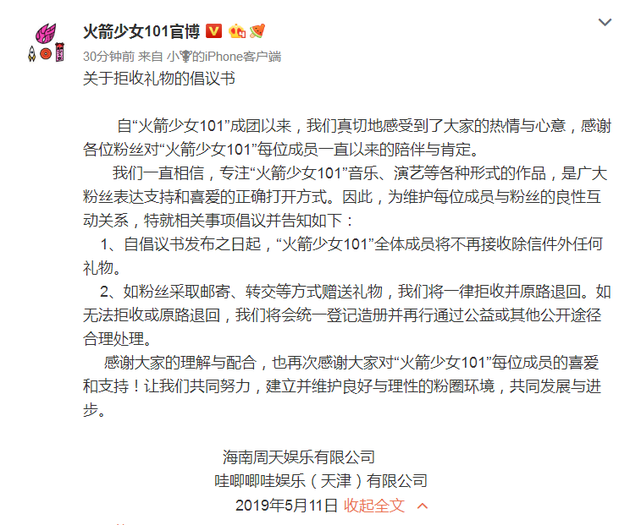 “火箭少女”官博发倡议书:不再接收粉丝礼物 12 May , 2019 | 娱乐前线 火箭少女101官博发布“拒收礼物倡议书”,表示从即日起,“火箭少女101”全体成员将不再接收除信件外任何礼物。 火箭少女倡议拒收礼物 火箭少女101官博发布“拒收礼物倡议书”,表示从即日起,“火箭少女101”全体成员将不再接收除信件外任何礼物。如粉丝采取邮寄、转交等方式赠送礼物,我们将一律拒收并原路退回。如无法拒收或原路退回,我们将会统一登记造册并再行通过公益或其他公开途径合理处理。 分享