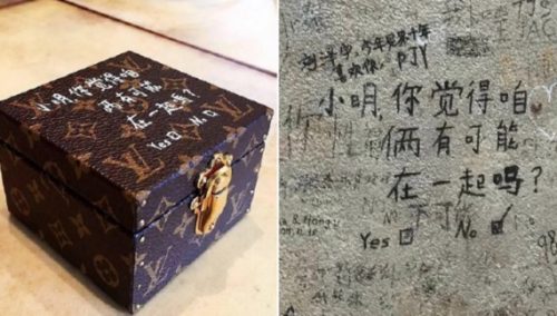 何猷君为求婚花足了心思,用了知名牌珠宝盒当成戒指盒,盒子上面印的一句话,原来还有故事。盒子印上:“小明,你觉得咱俩有可能在一起吗?yes or no。”这是之前他们一起上中国综艺节目,两人约会时何猷君写在恋爱巷墙上表白的一句话。