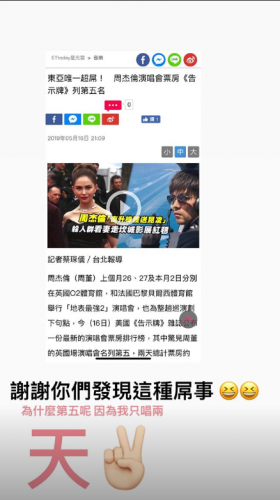周杰伦回应演唱会票房排第五:因为我只唱两天 17 May , 2019 | 娱乐前线 据台湾媒体报道,美国《公告牌》杂志公布了一份最新的演唱会票房排行榜,其中周杰伦的英国演唱会名列第五,并公布了统计两天的票房。周杰伦看到此消息后在社交平台上发文回应称:“谢谢你们发现了这种‘屌事’,为什么第五呢,因为我只唱两天。” 网友看到后纷纷表示太可爱了,评论调侃“杰伦还在意这个的”、“厉害还是你厉害啦”。 分享
