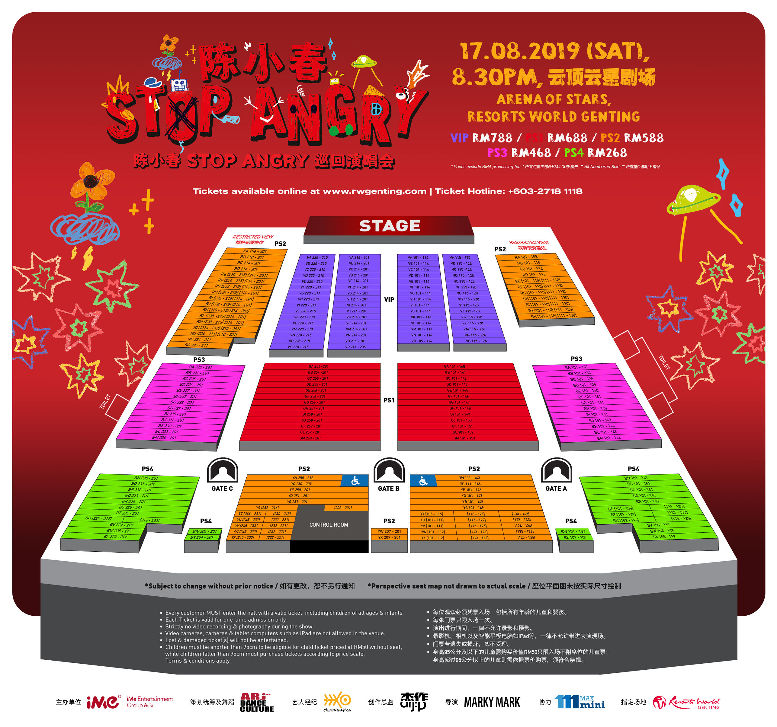 这场由iMe主办的陈小春《STOP ANGRY》巡回演唱会马来西亚站,将于2019年5月21日(星期二),中午12时正式公开发售。票价分为RM788、RM688、RM588、RM468和RM268(所有门票不包含RM4手续费)。欲知更多演唱会详情,请拨电+603-27181118或浏览www.rwgenting.com。