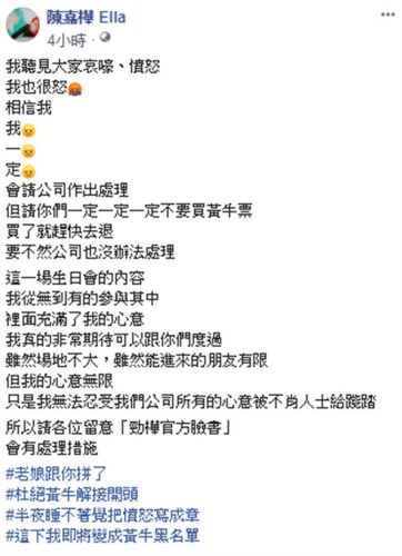 Ella庆生趴“0元门票”,昨天中午一点开放免费索取,不到一分钟就被抢购一空,不过几乎都被黄牛得手,让粉丝纷纷向Ella敲碗能开直播或加场,对此Ella凌晨在脸书PO文呼吁粉丝务必拒买黄牛票,如果买了就赶快退票,否则公司也没办法处理,而她更强调这是出道以来首场生日会,内容全程都参与构思,原本非常期待可以跟粉丝度过,未料心意都被不肖人士给践踏,立刻开呛黄牛:“老娘跟你拼了”。
