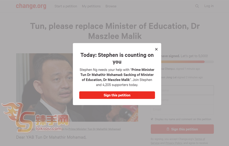 一名名为Stephen Ng的家长,早在3星期前,在“Change.org”网上致函给马哈迪,要求马哈迪撤换马智礼,截至目前,已有6万8600人联署,认同Stephen Ng的论点。