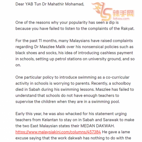 根据联署内容,该名家长指出,马哈迪的受欢迎程度一再下跌的主因,是因为马哈迪拒绝聆听民意。