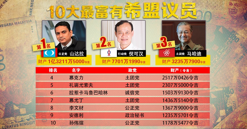 至于马哈迪,月收入是7万5861令吉,申报资产额是3235万7900令吉,分别位居“最富有议员”第3位,及“最高收入议员”第7位。