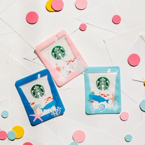 在阳光的照射下,粉色透明的马赛克瓷砖设计,会呈现出海水在阳光下的感觉,仿佛把我们直接带到了海底世界,非常美丽!除了珊瑚及可爱海底生物,星巴克也推出带有美人鱼标志图案的拉链袋,三款配色同样贯彻梦幻感!