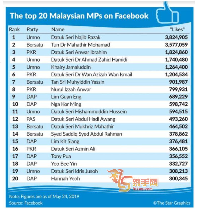 根据《星报》的分析报导,在第14届全国大选落幕一年后,有多达86%或相等于191名国会议员在脸书非常活跃,包括在脸书上载各个文告、更新资讯和个人分享等等,其中现任首相敦马哈迪和前任首相纳吉,使用社交媒体率更是在众多议员之中排行第一和第二名。