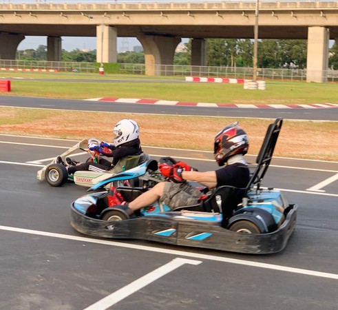 Kimi身穿黑色短袖T恤,内搭长袖运动衣,手套,脚踩运动鞋,和林志颖并肩站在一起,加上戴安全帽,高度只差一个头的距离。他在爸爸指导下学开卡丁车,独自操纵方向盘,在赛道上奔驰,父子俩更开着大小赛车绕场。