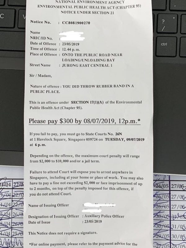 一条橡皮筋竟值909令吉? 27 May , 2019 | 民生百事 (新加坡27日讯)你以为在公路上随手丢掉一条橡皮筋就神不知鬼不觉?大错特错! 根据新加坡面子书社团All Singapore Stuff发表的一则帖文,指有一名新加坡公民在公路上丢弃橡皮筋而被罚款300新币(约909令吉)。 根据上述罚单所指的“犯罪”地点,是在新加坡裕廊东发生。 罚单上也阐明,事主在路上丢弃橡皮圈,触犯了该国公共卫生法令95章17(1)(A)条文,并促请事主在7月8日中午12时前必须缴付罚款。 分享