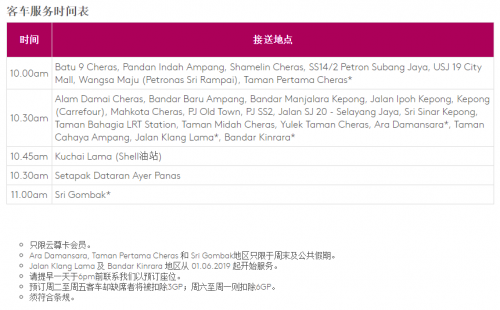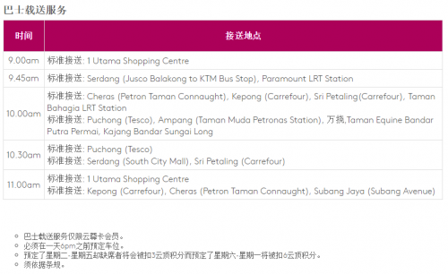想要乘搭免费巴士的朋友,必须在前一天的傍晚6时前预定!如在星期二至五期间,进行预订却缺席者,将会被扣3云顶积分;星期六至一预订缺席,则被扣6积分!
