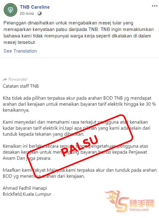 国能无调涨电费 29 May , 2019 | 民生关注 (吉隆坡29日讯)千万不要广传和相信网络的不实消息! 国能今日在官方脸书专页发表文告澄清,该公司并没有接获调高电费至30%的指示,促请民众勿相信在社交平台流传的电费涨价30%信息。 国能同时也强调,该信息内的“员工”,并不在国能内工作。 国能说,国内电费是由能源委员会决定,因此民众应停止转发有关不实讯息。 分享