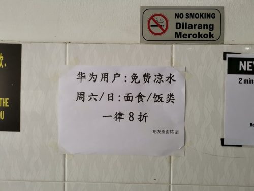 蕉赖一家面馆东主在店外张贴“华为用户免费凉水,周末面饭一律8折”,中国驻马大使白天“闻风而至”,表示“自己是华为手机用户”。